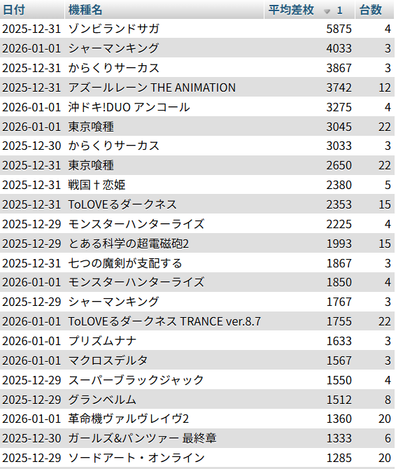 ※2026/1/3の結果データからカウント| 機種名 | 🏝 | 🧭 | 🍎 |